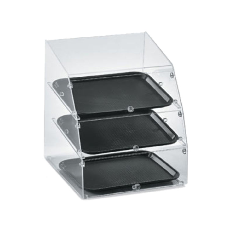 The Vollrath LBC1418-3F-06 Display Case Counter Top Curved Front is a versatile self-service unit designed for non-refrigerated use, ideal for various food service environments. Measuring 18-1/2 inches in width, 19-3/4 inches in depth, and 22 inches in height, this display case is compact yet spacious enough to accommodate three 14 by 18-inch trays, which are included with the unit. The case features a curved front design, enhancing visibility and access for customers while maintaining a sleek appearance. Constructed from clear acrylic, the display case provides excellent clarity for showcasing products, ensuring they are visible from multiple angles. With three front doors, this unit facilitates easy access for both customers and staff, streamlining service in busy environments. The Vollrath LBC1418-3F-06 is particularly suited for bakeries, cafés, and other food service operations that require an efficient, attractive way to display pastries, bread, or other non-refrigerated items. Its durable construction and practical design make it a reliable choice for establishments seeking to enhance their presentation and service efficiency.