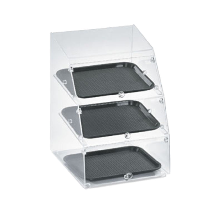 The Vollrath MBC1014-3F-06 Display Case Counter Top Curved Front is a meticulously designed display solution, engineered to enhance any self-service setting with its sleek, non-refrigerated structure. With dimensions of 14-1/2 inches in width, 17 inches in depth, and 21 inches in height, it provides a compact yet spacious display option that fits seamlessly into various environments. This display case accommodates three 10 x 14-inch trays, making it suitable for showcasing a diverse range of items, from baked goods to fresh produce. Its curved front design not only adds an aesthetic touch but also facilitates easy viewing and access to the displayed items. The inclusion of three front doors enhances accessibility, allowing for convenient self-service. Constructed with clear acrylic, the display case ensures durability while providing a crystal-clear view of the contents, making it an excellent choice for retail spaces, cafés, and bakeries looking to present their products attractively. The Vollrath MBC1014-3F-06 combines functional design with practical features, catering to the needs of different market segments by offering a reliable and visually appealing solution for product presentation.