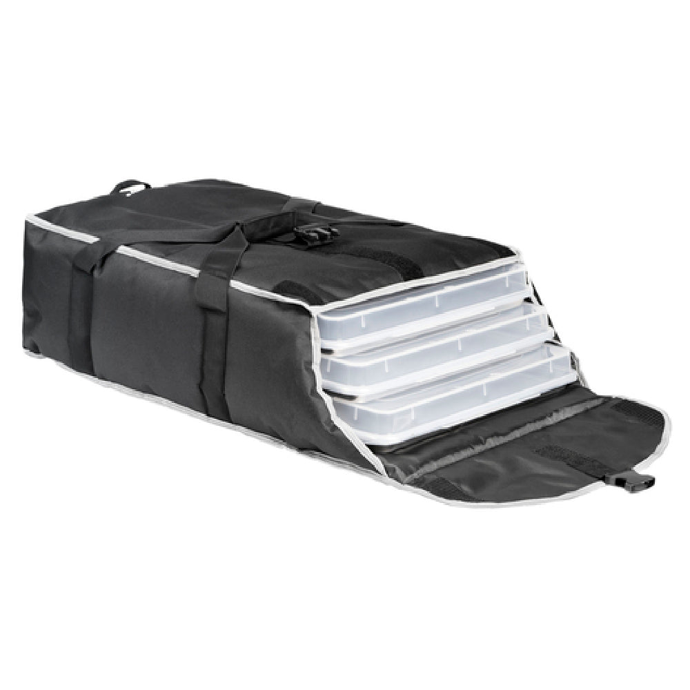 The Vollrath VSPB100 Full-Size Sheet Pan Catering Bag 1-Series is a versatile solution for catering professionals requiring efficient transport of food items. With dimensions of 19"W x 27"D x 9"H, this bag accommodates up to three full-size sheet pans with covers or rectangular pizza boxes, making it ideal for diverse catering scenarios. The bag's robust construction includes reinforced stitching and a sturdy bottom, ensuring durability and stability during transportation. A 2-inch thick insulation layer maintains temperature, while the moisture-resistant outer shell safeguards contents from environmental conditions. The bag's design incorporates durable zipper closures with a fold-over flap for secure sealing, complemented by convenient carrying straps for ease of handling. A polyester liner adds to the bag's resilience and ease of cleaning. Its collapsible nature allows for efficient storage when not in use, maximizing space in busy kitchens. Additional features include a PVC window pocket for displaying branding, order slips, menus, or brochures, and reflective piping for enhanced safety during nighttime deliveries. This catering bag is an essential tool for catering businesses, offering reliability and functionality across various market segments in the food service industry.