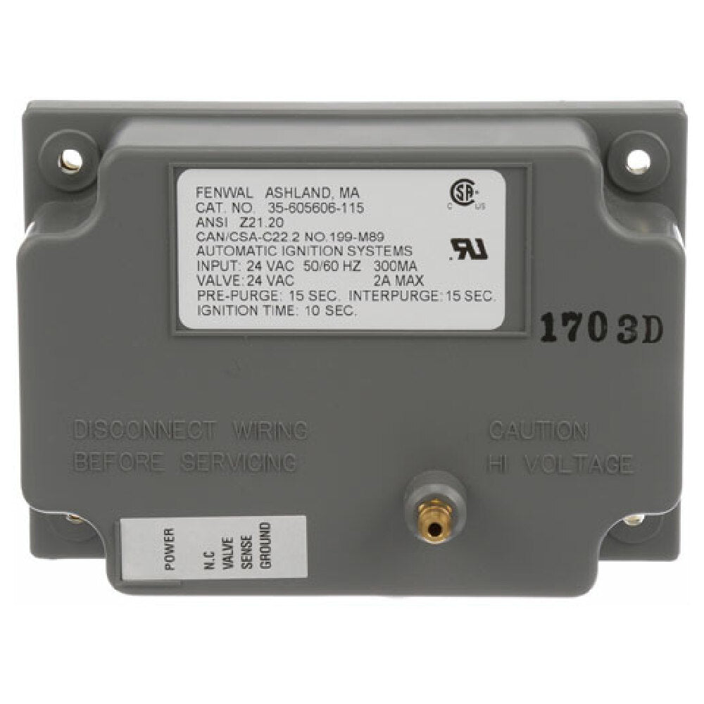 Vulcan Hart 354447-00001 Fenwall # 35-605606-115 24vac 50/60hz, Pre-purge 15 Sec Interpurge 15 Sec Ignition Time 10 Sec., 3-3/4" X 5-1/4 Grey Box Fenwal Spark Plug Type, 4-1/2" X 2-7/8" Mt Ctrs., Vulcan Oven Gco2c Gco2d, Wolf Oven