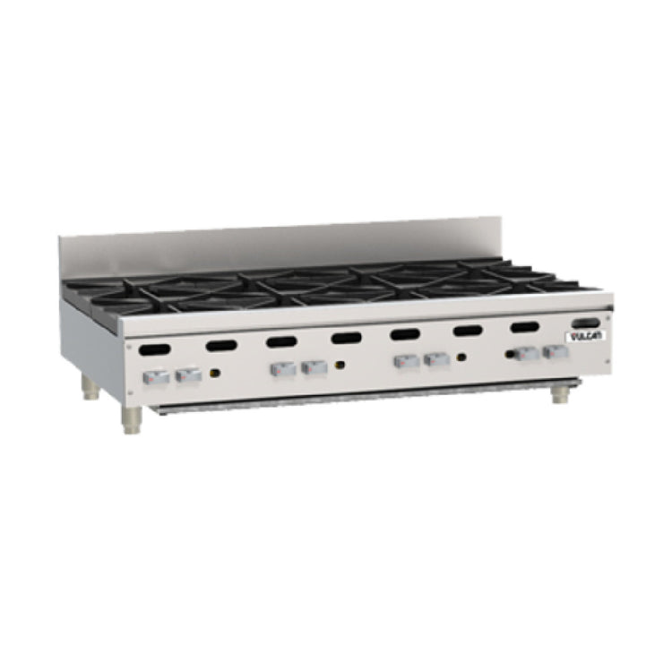 The Vulcan VHP848_LP Achiever Hotplate is a high-performance gas countertop appliance, measuring 48 inches in width, specifically designed for demanding culinary environments. It features eight open burners, each delivering a substantial 30,000 BTU output, with a reduced output of 27,500 BTU for LP gas, making it a versatile tool for various cooking needs. The hotplate is engineered with lift-off burner heads and protected standing pilots, ensuring ease of maintenance and reliability. Its cast iron top grates provide durability and even heat distribution, ideal for rigorous kitchen operations. The infinite heat controls allow for precise temperature adjustments, catering to a wide range of cooking techniques. Constructed with a stainless steel front, sides, and backsplash, the Vulcan VHP848_LP combines robust build quality with aesthetic appeal, enhancing any professional kitchen setup. An aluminized pull-out crumb tray facilitates easy cleaning, while the 4-inch adjustable legs offer stability and flexibility in installation. The unit is CSA and NSF certified, reflecting its adherence to stringent safety and sanitation standards. With a total capacity of 240,000 BTU, this hotplate is a powerful addition to food service establishments, ensuring efficiency and performance in high-volume cooking scenarios.