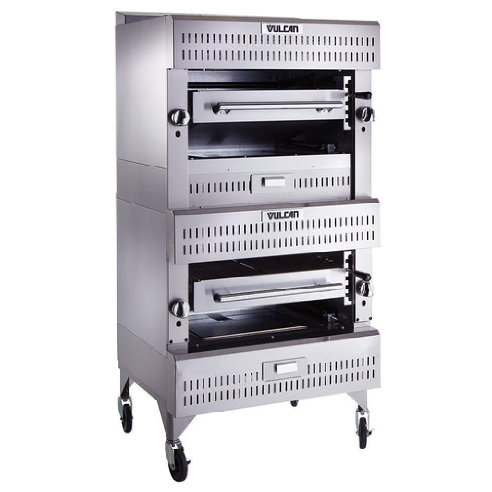 The Vulcan VIR2 V Series Deck-Broiler Heavy Duty Range Match Gas is an expertly crafted cooking appliance designed for high-demand culinary environments. This robust unit features double-deck infrared burners, delivering a substantial 200,000 BTU output, making it suitable for intensive cooking requirements across various sectors. With two spacious cooking grids measuring 25-1/2" x 24-1/2", it offers ample grilling space for professional kitchens, enhancing productivity and efficiency. The spring-balanced, 5-position grip allows for precise control over cooking processes, ensuring consistent results. Constructed with a stainless steel front, top, and sides, this broiler guarantees durability and longevity, crucial for sustaining rigorous kitchen operations. The inclusion of casters facilitates easy mobility, optimizing kitchen layout flexibility. Additionally, the 1" rear gas manifold with a regulator ensures a steady and safe gas supply, vital for maintaining operational safety standards. Certified by NSF, CSA Star, and CSA Flame, the Vulcan VIR2 V Series Deck-Broiler aligns with stringent health and safety regulations, reinforcing its reliability in varied culinary settings. This versatile broiler is an indispensable asset for restaurants, catering businesses, and institutional food service operations seeking a high-performance, durable, and efficient cooking solution.