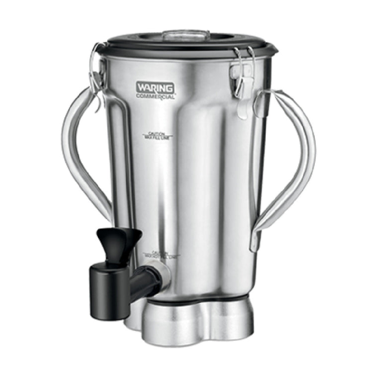 The Waring CAC125 Blender Container 128 Oz. (1 Gallon) includes-lid, spigot, and blade, making it an integral component for the CB15 series. Crafted from durable stainless steel, this blender container is engineered for heavy-duty use in high-volume settings, such as commercial kitchens and food service establishments. The large 128-ounce capacity allows for efficient preparation, reducing the need for multiple batches and ensuring consistency in large quantities. The inclusion of a spigot adds convenience for dispensing blends directly from the container, streamlining the operation process and minimizing spillage. Additionally, the robust blade design is tailored for optimal blending performance, capable of handling a variety of ingredients with precision. The compatibility with the CB15 series underscores its integration within professional setups, offering a reliable and efficient solution for chefs and kitchen staff. With its focus on functionality and efficiency, the Waring CAC125 Blender Container is a valuable asset for any establishment seeking to enhance their blending capabilities, providing both quality and performance in demanding environments.