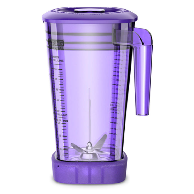 The Waring CAC95I-10 MX Series Blender Container is a specialized blending accessory designed for international use, featuring a 2-liter (64 oz.) capacity with a 0.33 cu. ft. volume. This blender container is crafted from durable copolyester material, ensuring a robust and reliable performance that caters to various market segments within the blending industry. Its distinct purple design not only adds a vibrant aesthetic touch but also signifies its unique application for diverse culinary environments. Engineered for use with the MX Series, this container combines efficiency with a sizable capacity, making it a practical choice for professional kitchens and commercial settings that demand high-volume blending tasks. Its compatibility with international electrical standards expands its versatility and usability across global markets, providing a valuable tool for chefs and food service professionals looking for dependable and efficient blending solutions. The Waring CAC95I-10's capacity and design are tailored to meet the rigorous demands of large-scale food preparation, whether in a bustling restaurant kitchen or an industrial food processing environment. Its construction supports both durability and performance, positioning it as a significant component for those who require consistent blending capabilities in their culinary operations.