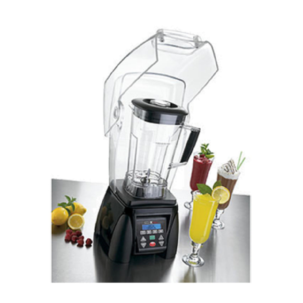 The Waring MX1500XTX Xtreme High-Power Blender Heavy Duty The Raptor™ boasts a 64 oz. BPA-Free copolyester container, setting a new standard in professional-grade blending technology. This high-power blender features a robust 3.5 HP motor and operates on 120v/50/60/1-ph with 13.0 amps, offering exceptional performance for various culinary applications. Its electronic keypad and LCD display with blue backlight provide user-friendly controls, enhancing precision and ease of use across four reprogrammable blending stations. The sound enclosure is a standout feature, reducing noise for a quieter operation, making it suitable for high-volume environments like cafes, bars, and restaurants. The one-piece removable jar pad ensures easy maintenance and durability, supporting consistent performance. As a product proudly made in the USA, it is both NSF and cETLus certified, guaranteeing compliance with strict safety and quality standards. The Waring MX1500XTX blends power and technology to meet diverse market needs, from small smoothie shops seeking reliable high-performance machinery to large-scale operations requiring efficient, heavy-duty blending solutions.
