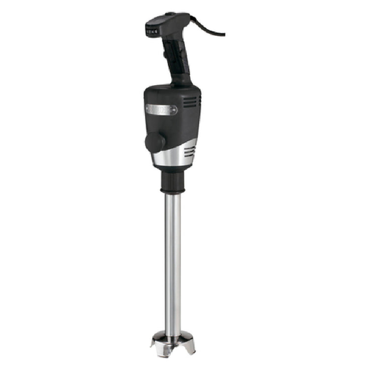 The Waring WSB55CE Big Stix® Immersion Blender is engineered for heavy-duty performance with a substantial capacity of 60 quarts (15 gallons), making it suitable for large-scale food preparation. This immersion blender features a robust 14-inch stainless steel removable shaft, ensuring durability and ease of cleaning. Equipped with a variable speed motor, it allows precise control over blending textures, catering to the diverse needs of the foodservice industry. The continuous ON feature enhances user convenience during extended blending tasks. Designed for user comfort, the blender includes a rubberized grip, minimizing hand fatigue during prolonged use. It operates on 230 volts and is compatible with 50/60 Hz, using a type F plug, which is tailored for international use, particularly within European markets. Compliant with CE and RoHS standards, it aligns with European safety and environmental regulations. The Waring WSB55CE immersion blender is an ideal choice for chefs and foodservice professionals seeking reliable performance and efficiency in demanding kitchen environments, whether in a bustling restaurant or a large-scale catering service.