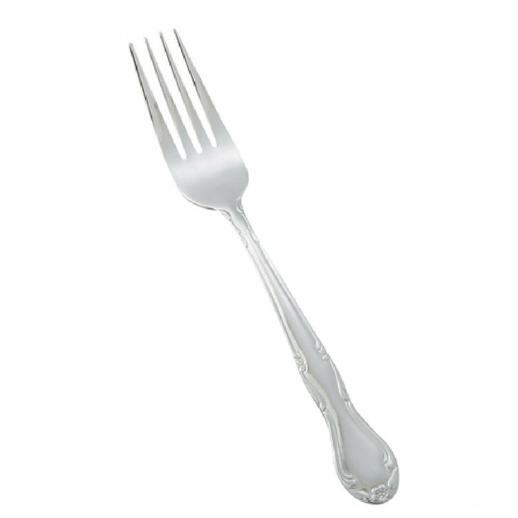 The Winco 0024-05 Dinner Fork 7-3/8" 18/0 Stainless Steel is a high-quality flatware piece designed to meet the diverse needs of both casual dining establishments and upscale culinary settings. Constructed from 18/0 stainless steel, this dinner fork ensures durability and resistance to corrosion despite frequent use. Its heavy weight construction speaks to its robustness, offering a substantial feel that enhances the dining experience for users who appreciate a sturdy utensil. The mirror finish not only adds a touch of sophistication but also simplifies cleaning, maintaining its lustrous shine through numerous washes. Part of the Elegance Plus line, this fork combines aesthetic appeal with practical functionality, making it an excellent choice for restaurants, catering services, and banquet facilities seeking to elevate their table settings. The 7-3/8 inch length is designed for optimal balance and comfort, accommodating a wide range of hand sizes. Whether used in a bustling restaurant or a formal event, the Winco 0024-05 Dinner Fork stands out as a versatile and reliable tool that caters to various dining environments, offering a seamless blend of style and performance that aligns with the demands of both professional and casual venues.