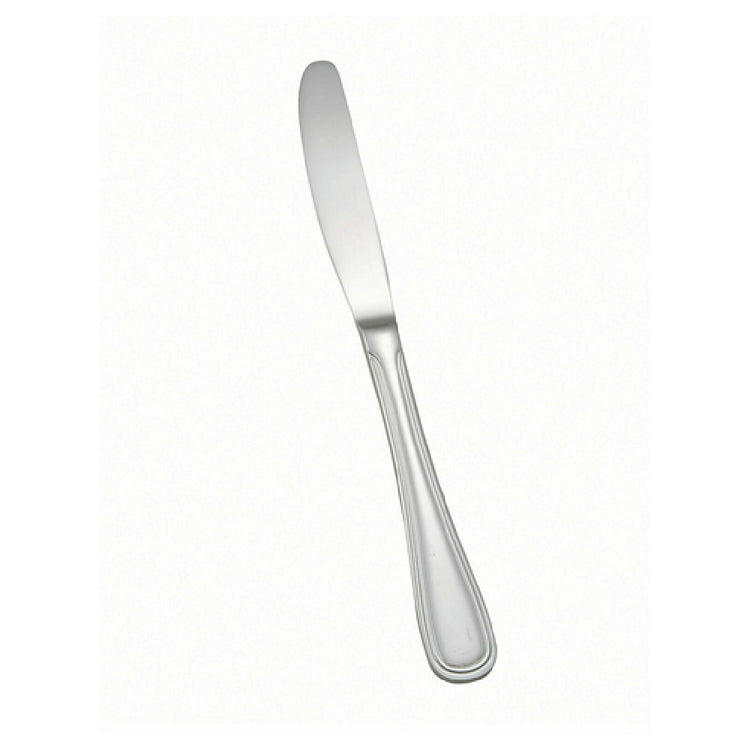 The Winco 0030-18 European Table Knife 9-3/4" 18/8 is a premium cutlery piece, designed with precision and expertise to meet the needs of various dining environments. Crafted from 18/8 stainless steel, this knife boasts an extra-heavy weight, providing a balanced and substantial feel in the hand. The mirror finish not only enhances its aesthetic appeal but also ensures long-lasting durability, resisting tarnish and maintaining shine even with regular use. Measuring at 9-3/4 inches, it is ideally suited for both formal and casual dining settings, making it a versatile choice for restaurants, hotels, and catering services looking to enhance their table settings. This knife is part of the Shangarila collection, recognized for its refined and sophisticated design. The superior construction and elegant design of the Winco 0030-18 European Table Knife make it an excellent addition to any cutlery collection, appealing to both professional chefs and home gourmets who appreciate high-quality dining tools. Its unique combination of weight, size, and finish sets it apart in the market, offering exceptional value and performance for a wide array of dining experiences.