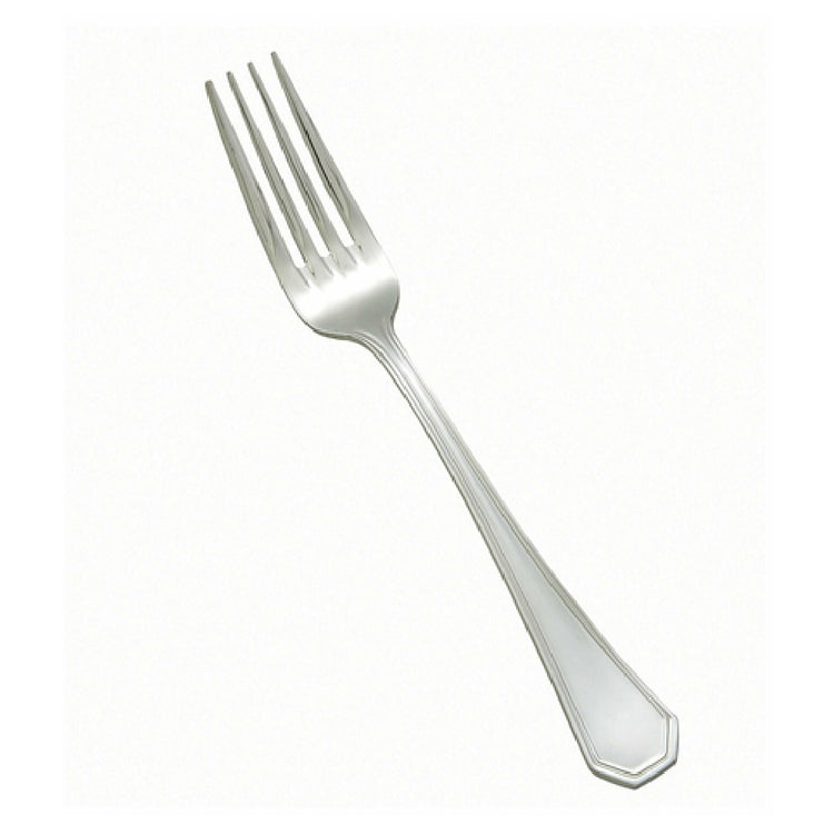 The Winco 0035-11 European Table Fork is a high-quality dining utensil that stands out with its 8-1/4 inch length and robust construction. Crafted from 18/8 stainless steel, this fork offers superior durability and resistance to corrosion, ensuring a long-lasting addition to your tableware collection. Its extra heavy weight provides a balanced and substantial feel in the hand, enhancing the dining experience for users across various market segments, from everyday home dining to professional catering services. The mirror finish not only adds an elegant touch but also makes maintenance straightforward, making it ideal for settings where presentation and ease of care are paramount. The fork's design is part of the Victoria line, renowned for its European-inspired aesthetics, which blend seamlessly into both traditional and contemporary table settings. This fork is a versatile choice for those in the food service industry looking for a reliable and sophisticated utensil that maintains its appeal over time. With its precise specifications and thoughtful design, the Winco 0035-11 European Table Fork is an excellent choice for enhancing any dining occasion with style and functionality.