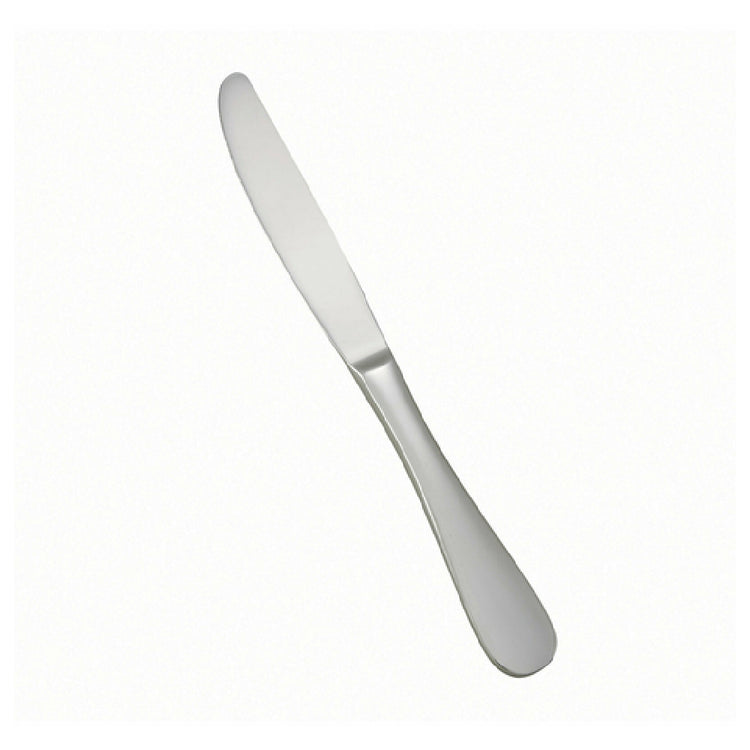 The Winco 0037-08 Dinner Knife 9-1/8" 18/8 Stainless Steel is a premium utensil designed to enhance any dining experience with its exceptional craftsmanship and functionality. Crafted from 18/8 stainless steel, a composition renowned for its durability and resistance to rust and corrosion, this dinner knife is built to withstand the rigors of both casual dining and formal settings. Measuring 9-1/8" in length, it offers a balanced weight distribution that provides ease of use, with an extra-heavy weight that signifies its superior quality. The mirror finish not only adds a touch of elegance but also facilitates easy cleaning and maintenance, making it a practical choice for busy restaurants and catering services. Part of the Venice collection, this knife complements a wide range of table settings, blending seamlessly with various styles and themes. Its robust construction and refined design make it suitable for upscale dining establishments, banquet halls, and high-end event venues, providing a reliable and stylish solution for cutting tasks. The Winco 0037-08 Dinner Knife is an indispensable tool for hospitality professionals seeking to deliver a sophisticated dining experience while ensuring long-lasting performance and satisfaction.