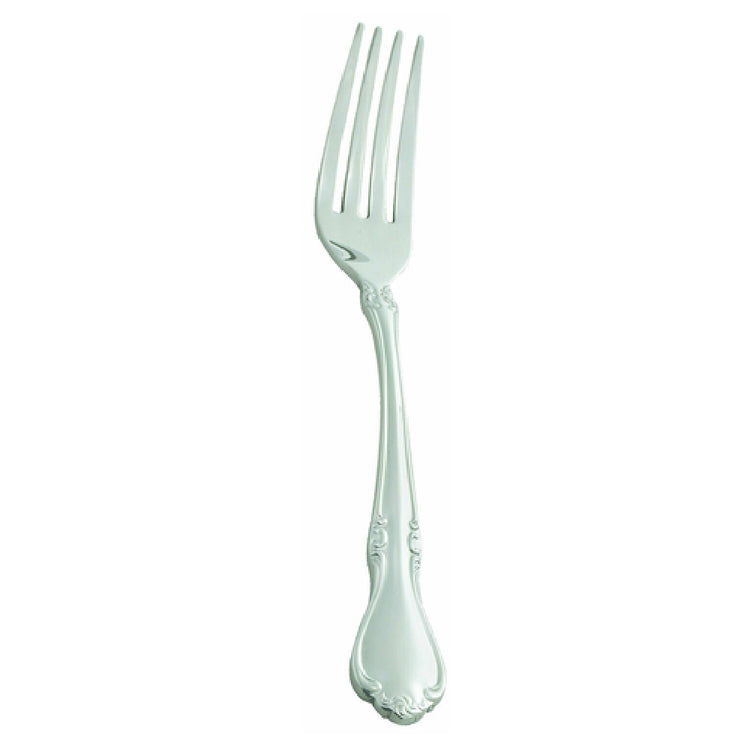 The Winco 0039-05 Dinner Fork is a meticulously crafted piece of cutlery, measuring 7-1/4 inches and constructed from 18/8 stainless steel. This extra heavy weight utensil is designed for durability and longevity, making it a reliable choice for both high-end restaurants and casual dining settings. The mirror finish gives this fork a refined and elegant appearance, perfect for enhancing the dining experience in upscale establishments. Part of the Chantelle line, this dinner fork combines aesthetic appeal with functional excellence. Its robust construction is ideal for withstanding frequent use in busy food service environments, while its sleek design complements a wide range of table settings. This versatile fork is suitable for various market segments, including hospitality, catering, and home dining, offering a high-quality option for those seeking both style and substance in their flatware choices. The 18/8 stainless steel composition ensures corrosion resistance and easy maintenance, providing a seamless blend of practicality and sophistication. With its thoughtful design and superior craftsmanship, the Winco 0039-05 Dinner Fork is a valuable addition to any dining ensemble, promising enduring performance and timeless elegance.