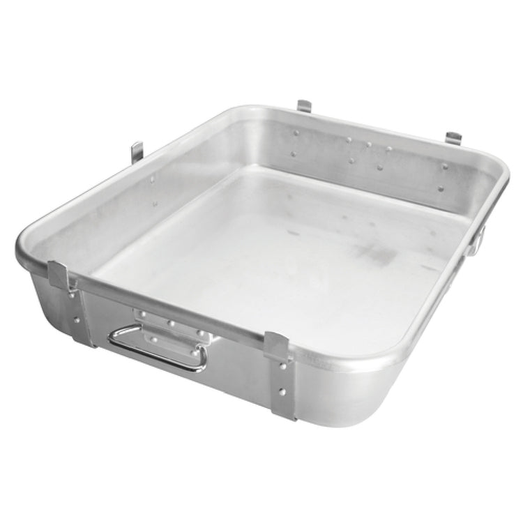 The Winco ALRP-1824L Double Roast Pan is an exceptional piece of cookware, crafted for heavy-duty use in professional kitchens. Measuring 24 inches by 18 inches with a depth of 4-1/2 inches, this rectangular pan provides ample space for roasting large quantities, making it a preferred choice for catering services, restaurants, and large-scale food preparation. Constructed from 2.4mm thick, 10-gauge aluminum, the pan ensures even heat distribution, essential for achieving perfect roasting results. The incorporation of straps and lugs enhances its durability and ease of handling, allowing for secure transport and maneuvering even when fully loaded. This robust design caters to the high demands of the food industry, offering both reliability and efficiency. The pan's high-quality aluminum construction not only contributes to its lightweight nature but also provides excellent resistance to corrosion, extending its lifespan under frequent use. The Winco ALRP-1824L Double Roast Pan stands out as a versatile and indispensable tool in any commercial kitchen setting, delivering consistent performance and meeting the rigorous standards expected by culinary professionals. Whether used for roasting meats, vegetables, or baking, this pan proves to be a valuable asset, embodying both quality and functionality.