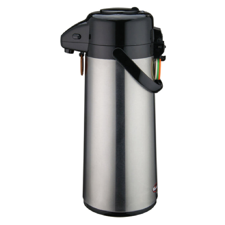 The Winco AP-525 Airpot 2.5 Liter Glass Liner is a meticulously engineered beverage dispenser, ideal for both commercial and personal use within the hospitality and food service industries. This airpot features a substantial 2.5-liter capacity, ensuring ample beverage storage for extended service periods. Its glass liner is specifically designed to maintain beverage purity and flavor, coupled with double-wall insulation that guarantees remarkable heat retention. The airpot retains heat for 10 hours at 171°F and 24 hours at 147°F, providing consistent temperature maintenance for hot beverages. The push-button mechanism facilitates easy dispensing, adding convenience for end-users. Furthermore, the stainless steel body with a satin finish not only enhances durability but also offers a modern aesthetic appeal. A swivel base allows for effortless 360-degree rotation, ensuring accessibility from any angle, which is particularly beneficial in high-traffic or shared spaces. For added practicality, the airpot includes four colored identification tags, aiding in the easy distinction of different beverages. The Winco AP-525 is an exemplary solution for caterers, office breakrooms, and self-serve dining areas, merging functionality with style to meet diverse market needs. This airpot stands as a reliable and efficient choice in beverage service equipment.