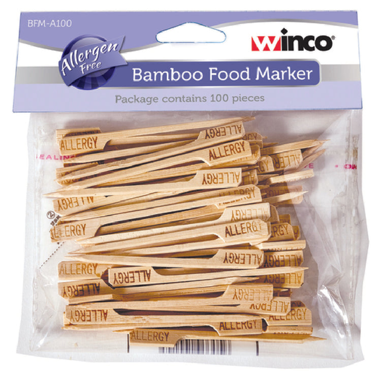 The Winco BFM-A100 Food Marker is a meticulously designed product with a length of 3-1/2 inches, crafted from high-quality bamboo, ensuring it is both durable and environmentally friendly. As an allergen-free item, it provides a vital solution for establishments in the food service industry that prioritize customer safety and need to clearly mark food items to prevent cross-contamination. Each pack includes 100 pieces, making it an economical choice for restaurants, cafes, and catering businesses that require bulk quantities to manage their daily operations efficiently. This food marker is specifically designed to be disposable, allowing for convenience and ease of use in fast-paced environments. Its bamboo construction not only supports sustainability efforts but also adds a touch of elegance and professionalism to food presentations. The Winco BFM-A100 stands out as a reliable choice for professionals seeking an effective and environmentally conscious food marking solution that aligns with health and safety standards, making it an ideal asset in any food service setting.