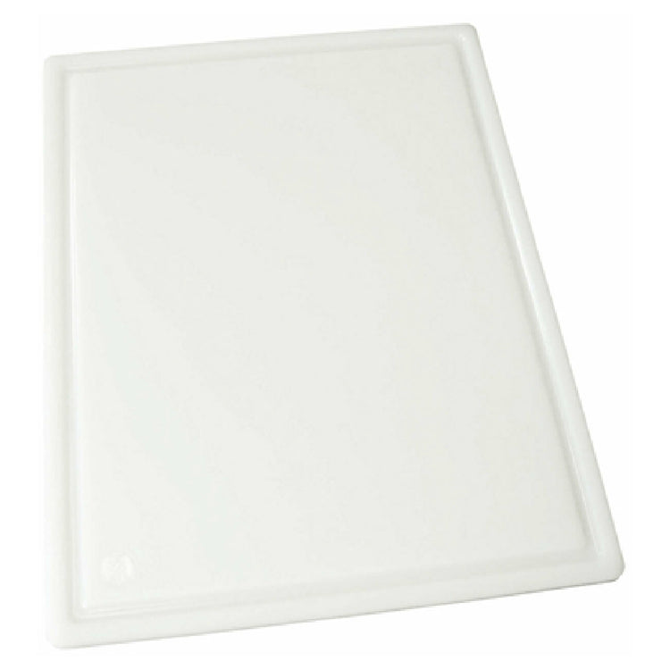 The Winco CBI-1824H Cutting Board is a versatile kitchen essential, crafted with precision to cater to various culinary needs. Measuring 18 inches by 24 inches and with a thickness of 3/4 inch, its substantial size offers ample space for a variety of food preparation tasks, making it a valuable asset for both professional chefs and home cooks. The board's rectangular shape is enhanced by a grooved design, which effectively prevents juices from spilling onto countertops, thus maintaining a clean and organized workspace. Made from BPA-free materials, this cutting board prioritizes safety and health, ensuring that no harmful chemicals leach into food during preparation. Its pristine white color not only provides a clean aesthetic but also helps in maintaining hygiene by allowing easy detection of any remaining food particles during cleaning. With NSF certification, the Winco CBI-1824H meets high standards of public health protection, making it a reliable choice for commercial kitchens where compliance is crucial. This cutting board’s robust construction and thoughtful design cater to the demanding environments of restaurants, catering services, and food service industries, offering a balance of durability and functionality that professionals seek in their kitchen equipment.