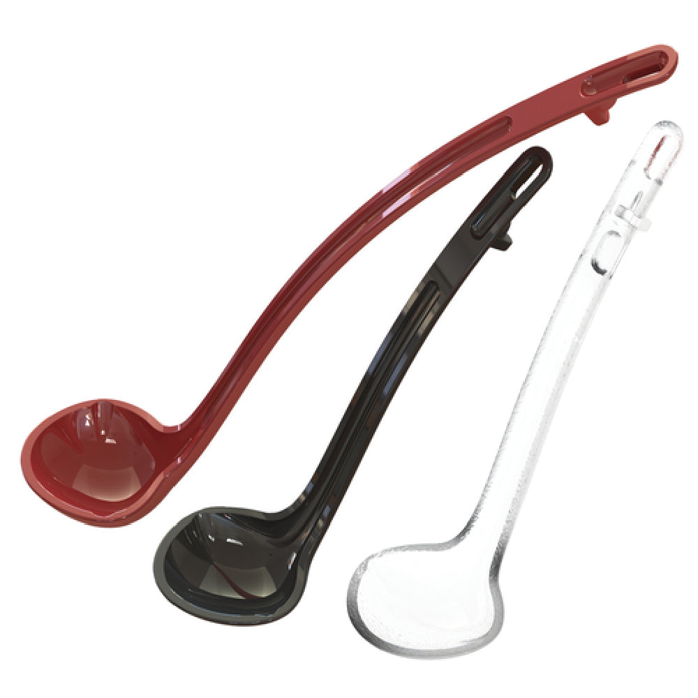The Winco CVLD-13R Ladle 1 Oz. 13" O.A.L. is a meticulously crafted kitchen tool, designed to meet the diverse needs of culinary professionals. This ladle, with its precise 1 oz. capacity, is ideal for portion control, making it a reliable choice for chefs in restaurants, cafeterias, and catering services. Its overall length of 13 inches, inclusive of an 11-1/2 inch handle, ensures a comfortable reach into deep pots and containers, enhancing the ease of use in busy kitchen environments. Constructed from durable polycarbonate, this ladle is not only sturdy but also lightweight, reducing user fatigue during prolonged use. The vibrant red color adds a visual cue for easy identification and organization in a bustling kitchen setup. Additionally, its NSF certification signifies compliance with rigorous public health standards, ensuring safety and reliability in food service applications. The Curvâ shape of the ladle offers improved ergonomics and control, enabling precise serving every time. Whether you are serving soups, sauces, or dressings, the Winco CVLD-13R Ladle is a versatile and essential tool that upholds the quality and efficiency required in professional culinary settings.