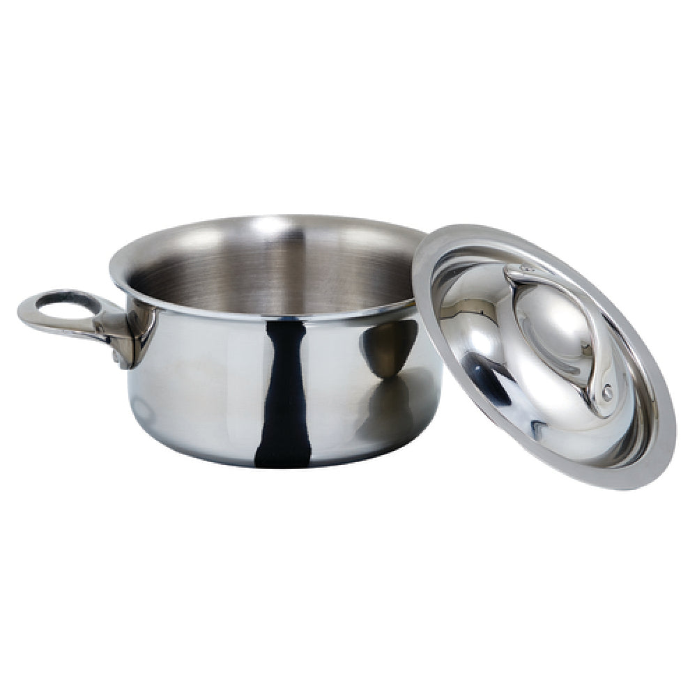 The Winco DCCR-3S Mini Casserole 15 Oz. 3-3/4" Dia. is a compact and versatile kitchen essential designed to meet the needs of both professional chefs and home cooks. With a capacity of 15 ounces and a diameter of 3-3/4 inches, this mini casserole is perfect for preparing and serving individual portions or side dishes. It is constructed with an 18/8 stainless steel exterior, known for its durability and resistance to corrosion, ensuring long-lasting performance in demanding cooking environments. The casserole features a tri-ply heavy-duty bottom with an aluminum core, which provides excellent heat distribution and retention, making it induction ready and suitable for various cooking surfaces. Two riveted handles offer a sturdy grip, enhancing safety and convenience during transport. The Winco DCCR-3S Mini Casserole is an ideal choice for restaurants, catering services, or home kitchens that require reliable and efficient cookware. Its sleek design and superior functionality make it a valuable addition to any culinary setting, appealing to different segments within the food industry seeking high-quality kitchenware. This mini casserole embodies both practicality and elegance, ensuring it meets the diverse needs of modern culinary professionals and enthusiasts alike.