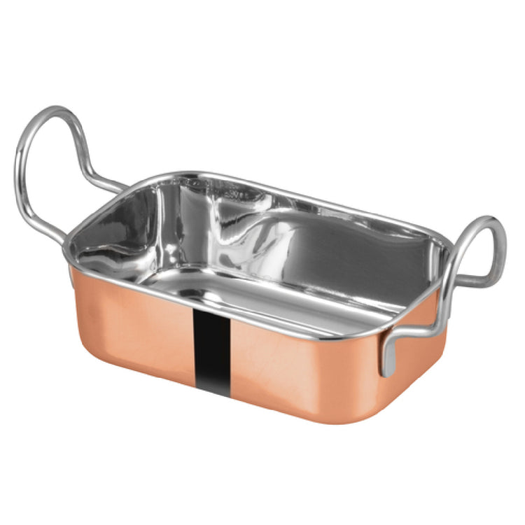 The Winco DDSB-204C Mini Roasting Pan is a compact and versatile kitchen tool, perfect for diverse culinary applications. With a capacity of 16 ounces, this pan is ideally suited for preparing individual servings or small portions, making it an excellent choice for both home cooks and professional chefs. Measuring 5-3/4 inches in width and 3-3/4 inches in depth, its rectangular shape is optimized for efficient cooking and roasting. Crafted with a visually appealing copper-plated finish, the mini roasting pan not only enhances the aesthetic of any kitchen space but also ensures even heat distribution for consistent cooking results. This feature is particularly beneficial for markets that prioritize precision and presentation in their culinary offerings. Whether used in a bustling restaurant environment or a home kitchen setting, the Winco DDSB-204C Mini Roasting Pan stands out as a practical and stylish option. Its durable construction and manageable size make it an essential addition for anyone seeking to expand their cooking repertoire with a reliable and aesthetically pleasing cookware piece.
