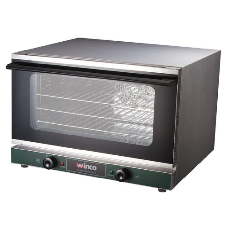 The Winco ECO-500 Convection Oven Countertop Half Size is a versatile and compact kitchen appliance designed for efficiency and precision. With a generous 1.5 cubic feet capacity, this convection oven accommodates various cooking needs, making it suitable for small-scale commercial kitchens and home use. Its three chrome interior shelves provide ample space for multiple dishes, enhancing cooking flexibility. The oven features a reliable dial control system and a built-in 120-minute timer with a "stay on" feature, allowing for precise cooking times and extended baking sessions. The dual-pane tempered glass door offers durability while providing a clear view of the cooking process. Constructed with stainless steel, the oven is designed for longevity and easy maintenance. Operating on 120v/60/1-ph with a power consumption of 13.3 amps and 1.6kW, the ECO-500 is energy efficient and compatible with standard electrical outlets, making it accessible for various environments. Certified by cETLus, this convection oven meets stringent safety and performance standards, ensuring reliable operation in professional settings. The Winco ECO-500 is an excellent choice for culinary professionals and enthusiasts seeking a compact, efficient, and reliable convection oven for diverse cooking applications.