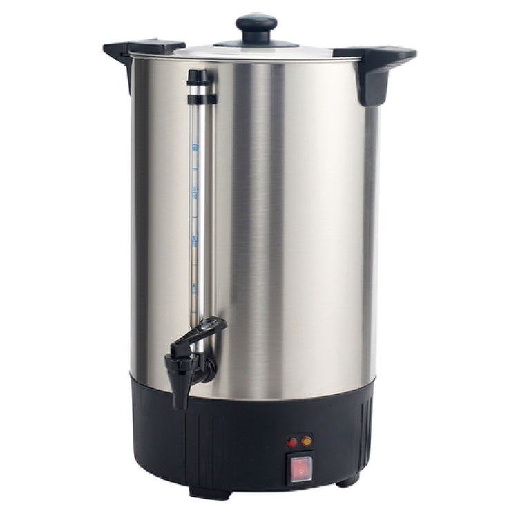 The Winco ECU-100A Commercial Coffee Urn is a robust solution for high-volume coffee service, designed with a capacity of 100 cups (16 liters) to cater to large gatherings and commercial environments. Featuring a twist-locking lid, this urn ensures secure operation and minimizes the risk of accidental spills. Its cool touch handles provide safe handling during use, reducing the risk of burns. The unit is equipped with a dripless faucet complemented by a protected level indicator, allowing for precise monitoring of coffee levels without messy drips. An essential safety feature, the automatic shut-off function prevents overheating, adding to the appliance's reliability. Constructed from 304 stainless steel, the urn promises durability and resilience in demanding settings. Its stainless steel percolator pipe ensures efficient coffee brewing, while the plastic filter baskets are designed for ease of use. With a power rating of 1.5kW and operating on 110-120v/60/1-ph, the urn is equipped with a NEMA 5-15P plug and holds CE and cETLus certifications, verifying compliance with safety standards. A waterproof ON/OFF switch with a protective cover adds an extra layer of safety. The Winco ECU-100A is perfectly suited for catering businesses, hotels, and other establishments requiring reliable, large-scale coffee brewing capabilities.