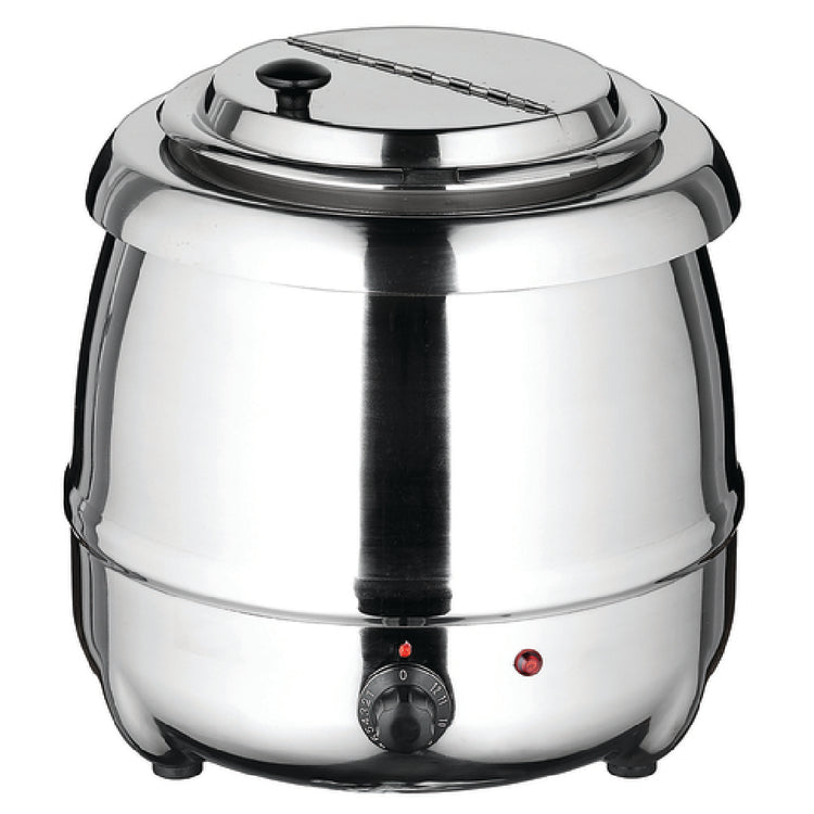 The Winco ESW-70 Soup Warmer Electric 10 Qt. is a versatile appliance designed to meet the needs of various market segments within the food service industry. Featuring a substantial 10-quart capacity, this soup warmer is equipped with adjustable heat control, allowing precise temperature management to maintain soups at optimal serving temperatures. Its hinged no-drip lid minimizes mess and spillage, ensuring a clean and efficient operation in busy kitchens. The removable 18/10 stainless steel bain marie inner pot provides durability and easy cleaning, essential for maintaining high sanitary standards. Its double-wall construction aids in retaining heat effectively. The inclusion of a suction cup label holder simplifies the organization and identification of contents, enhancing the user experience. Constructed of stainless steel, the Winco ESW-70 is built for lasting performance and reliability. Operating at 120 volts/60 Hz/1-phase with a power draw of 3.3 amps and 400 watts, it is energy efficient yet powerful enough for commercial use. The warmer's dimensions are 13-3/16 inches in diameter and 15 inches in height, making it a compact addition to any kitchen setup. Certified by ETL-Sanitation and cETLus, this product adheres to stringent safety and sanitation standards, making it a valuable addition to any food service establishment.