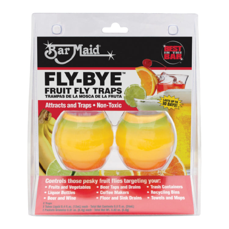 Bar Maid FLY-BYE Bar Maid Fly-Bye Fruit Fly Traps are an innovative solution designed to effectively attract and trap fruit flies using a non-toxic formula. Each pack contains two traps, providing a practical and convenient option for those seeking to mitigate fruit fly issues without resorting to harmful chemicals. With six packs per case, and a minimum quantity break of three cases, this product caters to both individual consumers and larger commercial establishments such as bars, restaurants, and cafes that require bulk quantities. Produced and packed by Cs, the Bar Maid Fly-Bye traps are ideal for maintaining a cleaner and more hygienic environment, especially in food service and hospitality settings where fruit flies can be particularly problematic. The ease of use and safety of these traps make them a versatile choice for a range of market segments, ensuring that environments remain free from the nuisance and contamination risks associated with fruit flies. The Bar Maid Fly-Bye Fruit Fly Traps offer a reliable and efficient solution for maintaining sanitary conditions in professional and personal spaces alike.