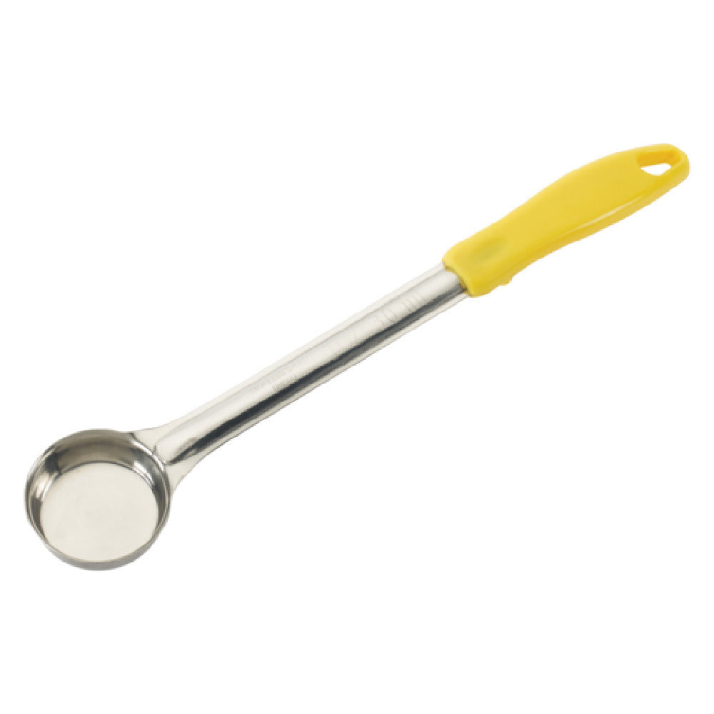 The Winco FPS-1 Food Portioner 1 Oz. One-piece is a meticulously designed utensil that serves as an essential tool in various culinary settings, offering precision and durability in food portioning tasks. Engineered as a solid, one-piece construction, this food portioner is crafted from high-quality stainless steel, ensuring longevity and resistance to corrosion, a key advantage in both commercial and home kitchens. The 1-ounce capacity is ideal for portion control, enabling chefs and kitchen staff to maintain consistency in servings, whether in a bustling restaurant, catering service, or institutional kitchen. The yellow handle is not only visually distinctive for easy identification among other kitchen tools but also adds a touch of color coding, enhancing operational efficiency and reducing cross-contamination risks. This product's simplistic yet robust design underscores its practicality and ease of use, catering to the needs of food service professionals who require reliable and precise portioning equipment. The Winco FPS-1 is particularly valuable in environments where standardization and speed are crucial, such as in fast food operations, school cafeterias, and buffet services, making it a versatile addition to any food service establishment's array of kitchen tools.