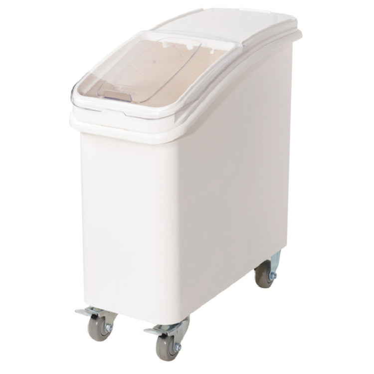 The Winco IB-21 Ingredient Bin is a versatile storage solution designed for the efficient organization of bulk ingredients, featuring a 21-gallon capacity. Its dimensions are 13 inches by 29-1/4 inches by 28 inches, making it a compact yet spacious option for industrial kitchens, bakeries, or restaurants. The bin includes a transparent polycarbonate lid that allows for easy visibility of contents, while the clasp sliding lid design ensures secure closure and convenient access. The inclusion of a scoop streamlines the process of measuring and transferring ingredients, enhancing operational efficiency. The bin is equipped with 3-inch caster wheels, two of which have brakes, providing effortless mobility and stability when needed. Constructed with a durable polypropylene body in a clean white finish, the Winco IB-21 is built to withstand the demands of busy food service environments. Certified by NSF, it meets the rigorous standards for safety and sanitation required in the industry. This ingredient bin is an indispensable asset for any food service business seeking to maintain an organized and hygienic workspace while maximizing storage capacity and accessibility.
