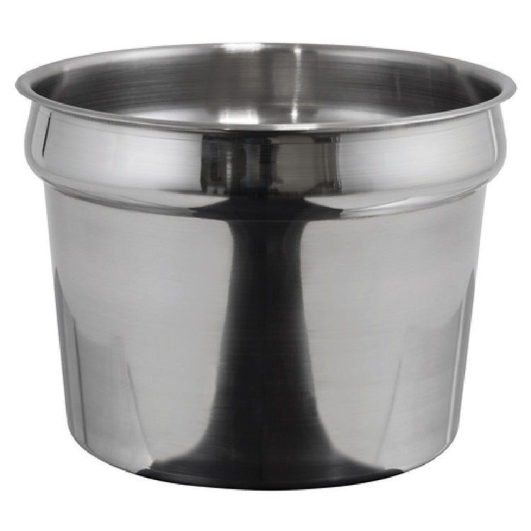 The Winco INS-11.0M Inset 11 Qt. 11-1/2" X 9" is a meticulously designed kitchen essential, crafted to cater to the diverse needs of various industry segments. With an 11-quart capacity, this round inset is a perfect fit for model 211, showcasing its versatility in adapting to different culinary setups. Constructed from heavy-weight stainless steel, it boasts a durable 24-gauge thickness, ensuring long-lasting performance and resilience under heavy usage. The mirror finish adds a touch of elegance, making it not just functional but also aesthetically pleasing for open kitchen environments or buffet presentations. Measuring 11-1/2 inches in diameter and 9 inches in height, this inset is engineered to optimize space while maintaining a substantial volume, making it ideal for both restaurant kitchens and catering services. The Winco INS-11.0M is not only a testament to durability and design but also a practical solution for food service professionals seeking reliability and quality in their kitchen equipment.
