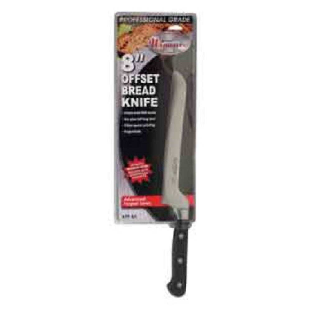 The Winco KFP-83 Acero Bread Knife is a precise cutting tool designed with the professional kitchen in mind. With an overall length of 13-1/4 inches and an 8-inch blade, this knife is ideal for slicing through loaves with ease and precision. Its German high carbon stainless steel construction ensures superior sharpness and durability, making it a reliable choice for busy culinary environments. The blade's offset design contributes to enhanced cutting efficiency, allowing for effortless slicing without compromising the integrity of the bread's crumb. This knife features a triple riveted, one-piece, full tang design, which provides exceptional balance and strength, essential for prolonged use in commercial settings. Complementing the robust blade is the injection molded POM handle, which offers a comfortable and secure grip, reducing hand fatigue during extensive use. This handle is black and adds a sleek, professional appearance to the knife. Additionally, the Winco KFP-83 Acero Bread Knife is NSF certified, indicating its compliance with stringent public health and safety standards, making it suitable for both small bakeries and large-scale foodservice operations. Its combination of durability, precision, and safety makes it a valuable tool for chefs and bakers seeking reliable performance in their culinary tasks.