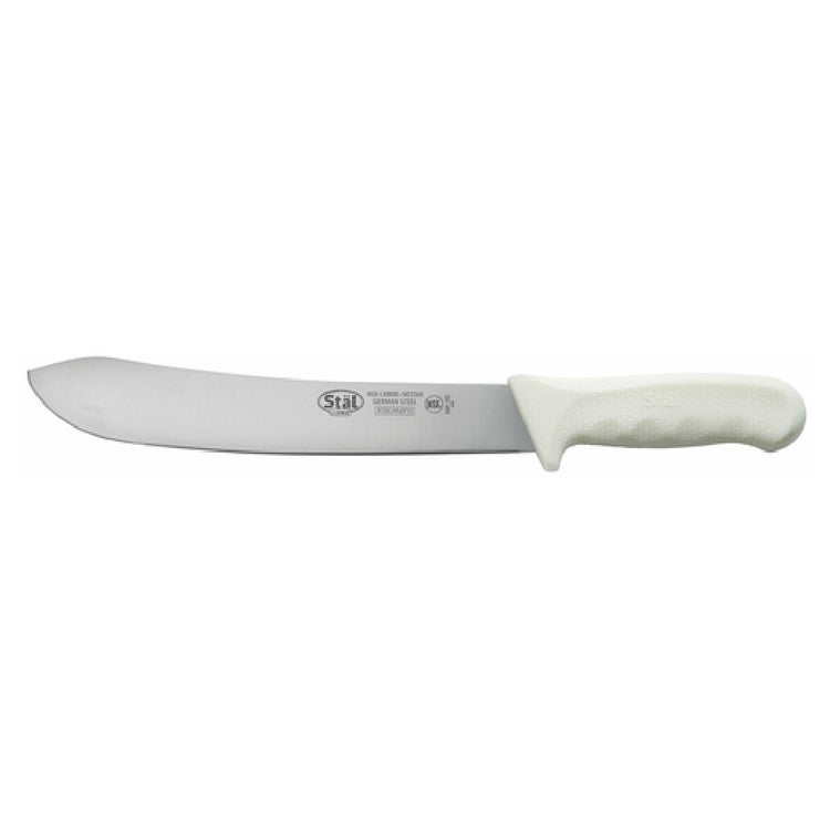 The Winco KWP-102 Butcher Knife 10" Blade is a meticulously crafted tool designed for both professional and home kitchens. Featuring a 10-inch blade, this butcher knife is stamped from high-carbon, no-stain German steel, ensuring durability and resistance to corrosion while maintaining a sharp edge. The high-carbon content enhances the knife’s strength and edge retention, making it an ideal choice for tasks requiring precision and reliability. The polypropylene handle provides a secure and comfortable grip, reducing hand fatigue during extended use. Its white color adds a sleek aesthetic appeal, complementing any kitchen decor. The blade's material, German steel, is renowned for its hardness and resistance to wear, ensuring longevity and performance in demanding environments. Certified by NSF, the Winco KWP-102 adheres to strict standards of safety and sanitation, making it suitable for use in food service industries such as restaurants, butcher shops, and catering services. This knife is designed to meet the diverse needs of culinary professionals and enthusiasts who require high-quality, reliable tools for their cutting and butchering tasks. Its superior construction and ergonomic design make it a valuable addition to any kitchen arsenal.