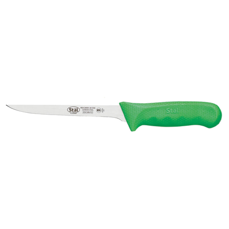 The Winco KWP-61G Boning Knife 10-7/8" O.A.L. 6" Blade is a precision tool designed for professionals in the culinary industry, structured to meet rigorous standards of performance and durability. Its 6-inch narrow, straight, and stiff blade is crafted from high carbon, no-stain German steel, providing exceptional sharpness and resistance to wear, making it ideal for the intricate task of boning. This knife features a stamped blade design, contributing to its lightweight nature, enhancing maneuverability and ease of use for chefs and butchers alike. The polypropylene handle, colored in distinctive green, ensures a comfortable grip and easy identification in a busy kitchen environment. It is NSF certified, assuring its compliance with hygiene and safety standards, which are critical in food preparation settings. The overall length of the knife is 10-7/8 inches, striking a balance between control and reach, making it suitable for a variety of boning tasks across different types of meat. The Winco KWP-61G Boning Knife is engineered for professionals who demand precision, reliability, and efficiency in their culinary tools, making it an indispensable asset in restaurants, butcheries, and catering services where quality and performance are paramount.
