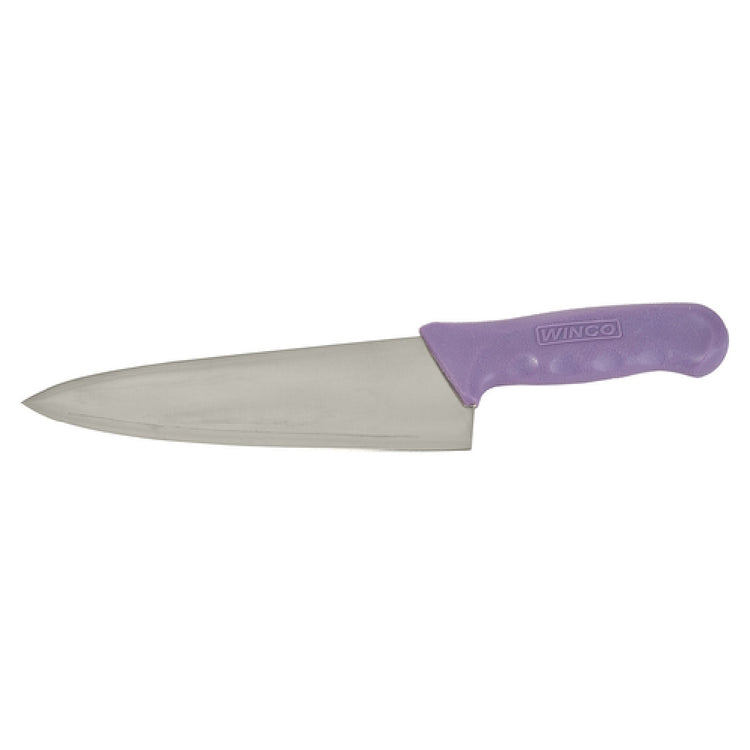 The Winco KWP-80P Chef's Knife - 8" Blade - Allergen Free is a meticulously crafted culinary instrument, designed to meet the rigorous demands of professional kitchens while ensuring safety and compliance. Featuring an 8-inch blade, this chef's knife is constructed from high carbon, no-stain German steel, also referred to as Stal, offering superior durability and resistance to staining. This makes it a reliable choice for chefs who prioritize longevity and performance in their kitchen tools. The stamped blade is complemented by a polypropylene handle, which is engineered for a firm yet comfortable grip, reducing hand fatigue during extended use. The handle's distinctive purple color not only adds an aesthetic appeal but also serves as an allergen-free indicator, helping prevent cross-contamination in environments where allergen management is crucial. This knife is NSF certified, assuring users of its adherence to public health standards, thereby enhancing its appeal to culinary professionals and establishments that value safety and quality. The Winco KWP-80P Chef's Knife is an indispensable tool for chefs, food preparation specialists, and kitchen staff across industries, ensuring precision, safety, and compliance in every culinary endeavor.