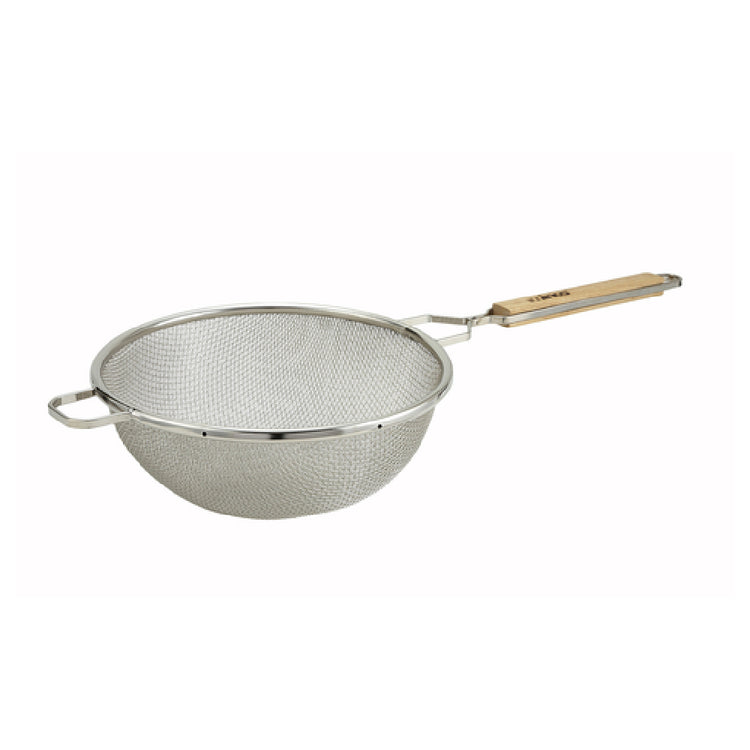 The Winco MST-10D Strainer is a well-designed kitchen tool featuring a 10-1/2" bowl diameter and an 11-1/4"L handle, making it suitable for a variety of culinary applications. With an overall length of 23-3/4", this strainer is engineered for optimal performance in both commercial and home kitchens. The round, double-tinned mesh offers durability and reliable functionality, ensuring that it can handle medium straining tasks with ease. The wood handle not only provides a comfortable grip but also ensures heat resistance, making it ideal for use with hot liquids or soups. This strainer is particularly valuable for those in the restaurant industry, catering services, or home cooking enthusiasts who demand high-quality kitchen tools that can withstand frequent use. The combination of a medium mesh with a sturdy wooden handle sets it apart as a versatile tool for straining sauces, stocks, or even fine grains, making it an essential addition to any kitchen setup. Its robust construction and practical design highlight its unique value proposition, catering to both professional chefs and amateur cooks who appreciate efficiency and reliability in their kitchen equipment.