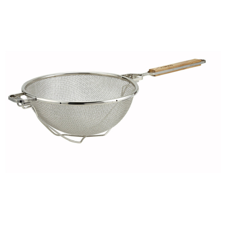 The Winco MST-10RB Strainer is meticulously crafted to cater to the needs of professional kitchens and home cooks alike, providing superior functionality and durability. With a bowl diameter of 10-1/2 inches, it is designed to handle substantial quantities, making it a versatile tool for various culinary applications. The strainer features a long 11-1/2 inch handle, offering excellent reach and leverage, while the overall length of 23-1/4 inches ensures convenient maneuverability and control during use. Its round, double tinned mesh design is robust, allowing for efficient straining of liquids and sifting of dry ingredients, proving indispensable in both commercial and domestic kitchens. The reinforced bowl with nickel plating enhances durability, ensuring longevity and resistance to wear over time. Complementing its sturdy construction, the strainer is equipped with a wooden handle, providing a comfortable grip and adding a touch of classic elegance to its design. The Winco MST-10RB Strainer stands out in the market for its practical design and reliable construction, making it an essential tool for chefs and cooking enthusiasts looking for quality and efficiency in their kitchenware. This strainer is a testament to Winco's commitment to delivering high-performance kitchen tools tailored to meet diverse culinary demands.