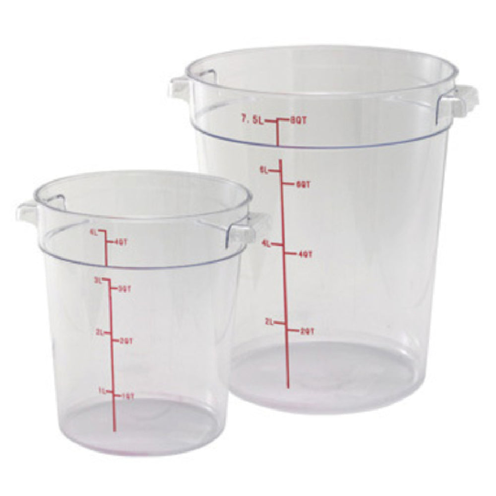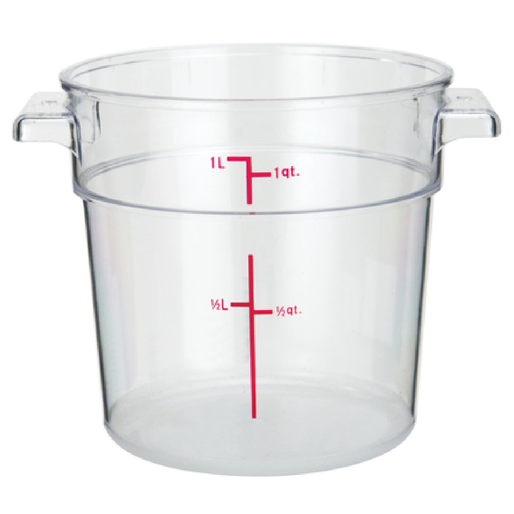 The Winco PCRC-1 Food Storage Container 1 Qt. 5-1/8" X 6-3/8" X 4-7/8"H is a versatile and durable solution for food storage needs, tailored for both commercial and home kitchens. This round, stackable container is made of clear polycarbonate, allowing easy visibility of contents while providing a robust temperature range of -40°F to 210°F. Its built-in handles facilitate seamless transport and handling, ensuring practicality in busy settings. The container features precise graduation markings in both quarts and liters, enhancing its utility for accurate portioning and inventory management. With dimensions of 5-1/8" x 6-3/8" x 4-7/8" in height, it is compact yet offers sufficient capacity for various food items. As a dishwasher-safe product, it promises hassle-free cleaning and maintenance. This NSF-certified container meets strict standards for public health protection, making it a reliable choice for professional kitchens, foodservice industries, and catering establishments. Its stacking capability optimizes storage efficiency in environments where space is at a premium. The Winco PCRC-1 is a trusted companion for those seeking efficient and safe food storage options, embodying quality and practicality in every aspect of its design.