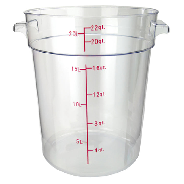 The Winco PCRC-22 Food Storage Container is a versatile and durable container, ideal for various commercial food service needs. With a substantial capacity of 22 quarts, this container is designed to accommodate large volumes, making it suitable for restaurants, catering services, and institutional kitchens. Measuring 14-1/2 inches by 14-3/4 inches with a height of 15 inches, the round, stackable design ensures efficient use of storage space while allowing multiple containers to be conveniently stored together. Constructed from clear polycarbonate, it provides excellent visibility of contents and is built to withstand a wide temperature range from -40°F to 210°F. This feature makes it adaptable for use in both freezing and hot conditions, providing flexibility in food storage and preparation. The built-in handles offer ease of transportation and handling, enhancing its practicality in busy kitchen environments. Additionally, the container is equipped with graduation markings in both quarts and liters, aiding in accurate measurement and inventory management. Being dishwasher safe, it ensures easy cleaning and maintenance, aligning with hygiene standards. The NSF certification signifies its compliance with public health and safety requirements, making the Winco PCRC-22 a reliable choice for food storage solutions in the food service industry.