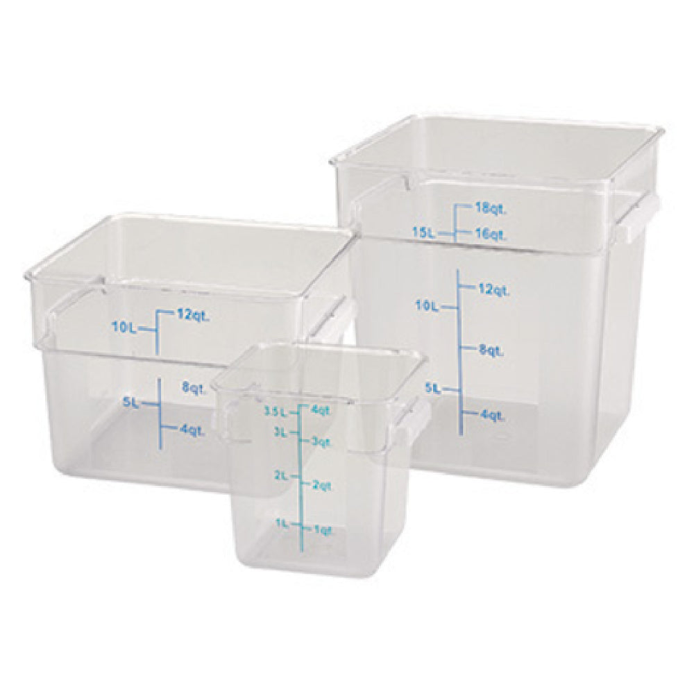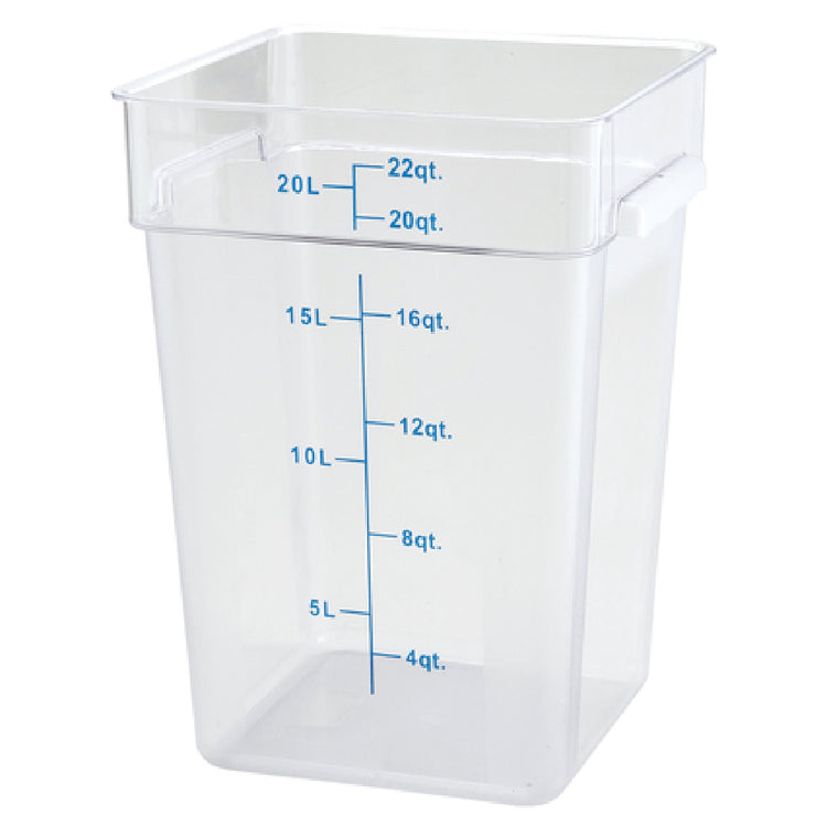 The Winco PCSC-22C Storage Container 22 Qt. 11-1/8" X 12-5/8" X 15-3/4"H is a versatile and durable solution for various storage needs in professional kitchens across multiple industry segments. This square storage container boasts a substantial 22-quart capacity, ideal for holding large quantities of ingredients or prepared food. Its stackable design, paired with built-in handles, facilitates efficient space management and easy handling, making it a practical choice for busy food service environments. The container features precise graduation markings in both quarts and liters, allowing for accurate measurement and inventory control. Crafted from clear polycarbonate, the Winco PCSC-22C ensures a high level of durability and visibility, helping kitchen staff quickly identify contents. With a temperature range of -40°F to 210°F, it is well-suited for both hot and cold storage applications, highlighting its adaptability and resilience. Moreover, this container is dishwasher safe, ensuring effortless cleaning and maintenance. NSF certification further underscores its compliance with strict public health and safety standards. The Winco PCSC-22C Storage Container is an excellent choice for culinary professionals seeking a reliable and efficient storage solution that meets the demanding requirements of the food service industry.