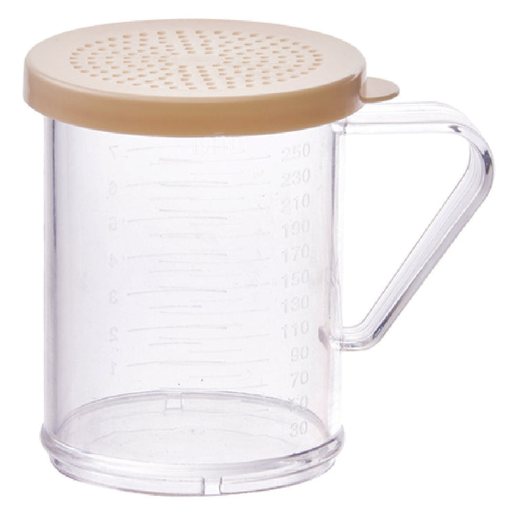 The Winco PDG-10B Shaker/Dredge 10 Oz. With Handle is an essential tool for culinary professionals and home cooks alike, known for its practical design and durable construction. This shaker/dredge features a 10-ounce capacity, making it suitable for a range of tasks, from sprinkling powdered sugar to dredging flour over meats. Its clear polycarbonate body provides visibility to its contents, ensuring you can monitor levels and avoid unexpected refills. The shaker comes with a beige snap-on lid, designed to secure ingredients and prevent spills during use. The addition of a handle enhances its usability, offering a comfortable grip that simplifies maneuvering and control in busy kitchen environments. The Winco PDG-10B is NSF certified, affirming its compliance with the highest standards of safety and hygiene, making it a reliable choice for commercial kitchens. The thoughtful design combines functionality with convenience, making this product a versatile addition to any food service operation, and particularly valuable in bakeries, restaurants, and catering services. Its robust polycarbonate construction ensures longevity and resistance to wear, marking it as a sound investment for those seeking efficiency and reliability in their kitchen tools.