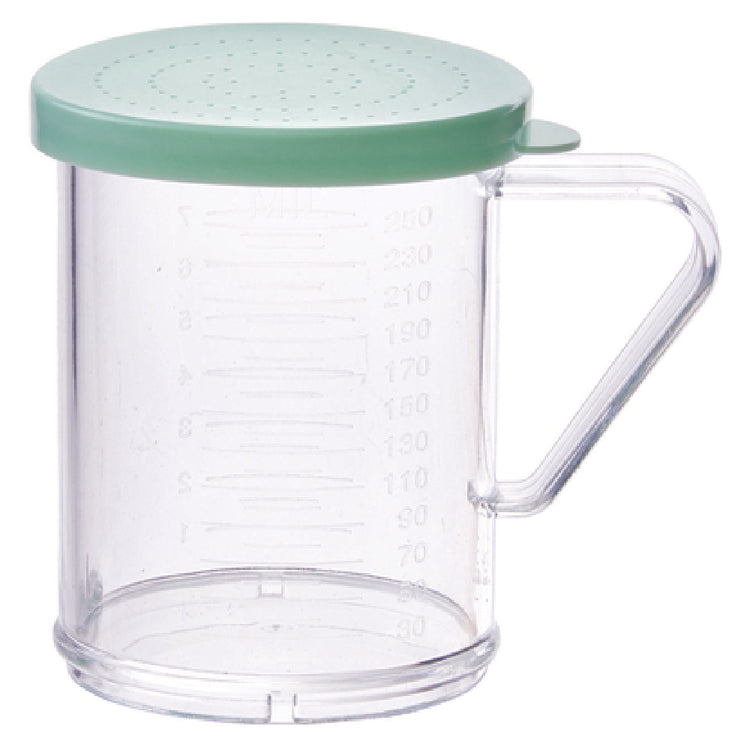 The Winco PDG-10G Shaker/Dredge 10 Oz. With Handle is an essential tool engineered for precision and durability, tailored for both professional kitchens and home culinary enthusiasts. This shaker/dredge boasts a 10-ounce capacity, making it perfect for dispensing an array of seasonings, from powdered sugar to spices, with ease. The inclusion of a sturdy handle enhances its practicality, allowing for secure handling during use. The green snap-on lid ensures contents remain fresh and protected from contaminants, while offering a quick and easy access. Constructed from durable polycarbonate, this shaker/dredge is both lightweight and resilient against impacts, promising longevity in high-demand environments. Its clear, transparent design allows for immediate identification of contents, streamlining workflow efficiency. Furthermore, the product is NSF certified, underscoring its compliance with rigorous health and safety standards, crucial for commercial kitchen operations. Ideal for restaurateurs, caterers, and food service professionals, the Winco PDG-10G Shaker/Dredge delivers functionality and reliability, seamlessly integrating into any culinary setting. Whether enhancing the presentation of dishes or seasoning culinary creations, this shaker/dredge is a versatile and indispensable tool in maintaining flavor consistency and culinary excellence.