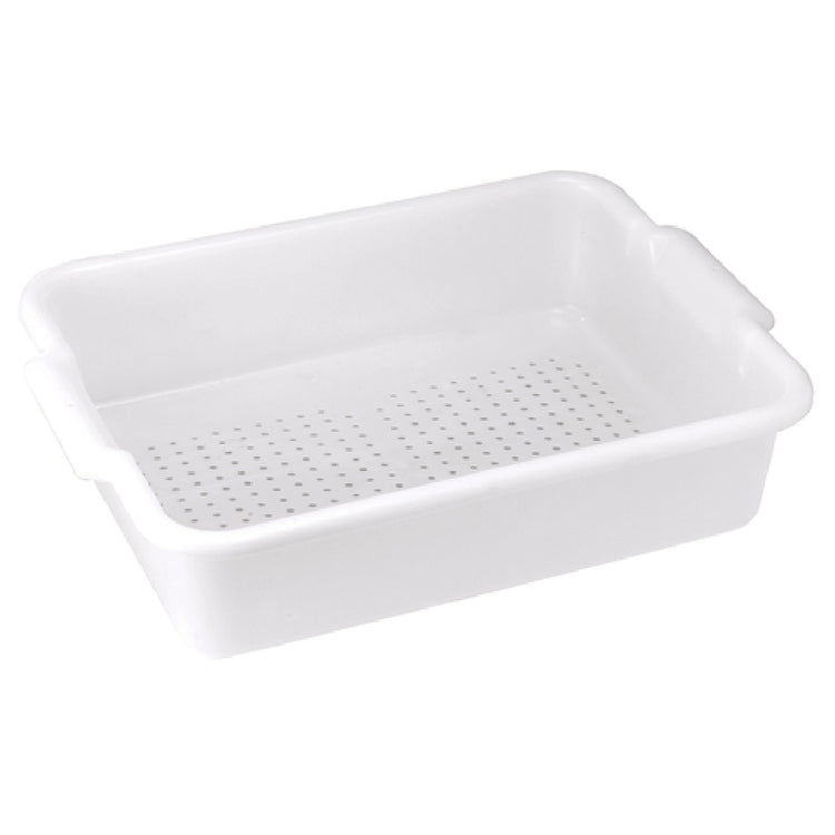 The Winco PLP-5W Bus Box is a meticulously crafted storage solution designed with precise dimensions of 21-1/4 inches in length, 15-3/8 inches in width, and 4-7/8 inches in height. Its perforated design ensures effective drainage, making it ideal for industries requiring efficient cleaning and drying processes, such as hospitality and food service sectors. Constructed from durable, BPA-free polypropylene, this bus box offers a safe and environmentally friendly option for handling and storing items. The pristine white finish not only enhances its aesthetic appeal but also aids in quick identification of contents. The Winco PLP-5W is particularly advantageous for restaurants and catering services where organization and hygiene are paramount. Its robust build supports reliable performance in high-demand environments, offering a practical and cost-effective solution for transporting and storing various kitchenware and utensils. This product's unique value lies in its combination of thoughtful design, safety, and functional efficiency, meeting the diverse needs of different market segments within the industry. Whether used in a bustling restaurant kitchen or a catering event, the Winco PLP-5W Bus Box stands out as a dependable and versatile tool in any professional setting.