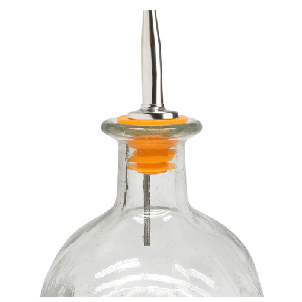 The Winco PPM-6 Liquor Pourer - oversized, medium flow is a specialized tool designed for efficient and precise liquor dispensing. This pourer is distinguished by its oversized structure, which facilitates a medium flow rate, ensuring a controlled pour that is ideal for bartenders and mixologists aiming for accuracy in their craft. The absence of a collar simplifies its design, making it easy to clean and maintain, while the plastic stopper ensures a snug fit in various liquor bottle openings. The chrome-tapered spout not only enhances the aesthetic appeal but also contributes to a smooth and consistent pour, reducing spillage and waste. Its yellow coloration makes it easily identifiable in a busy bar setting, aiding in quick selection among other bar tools. The Winco PPM-6 is crafted to meet the demands of professional environments, from high-volume bars to intimate cocktail lounges, where precision and efficiency are paramount. Its combination of durability and functionality makes it a valuable addition to any establishment striving for excellence in beverage service.