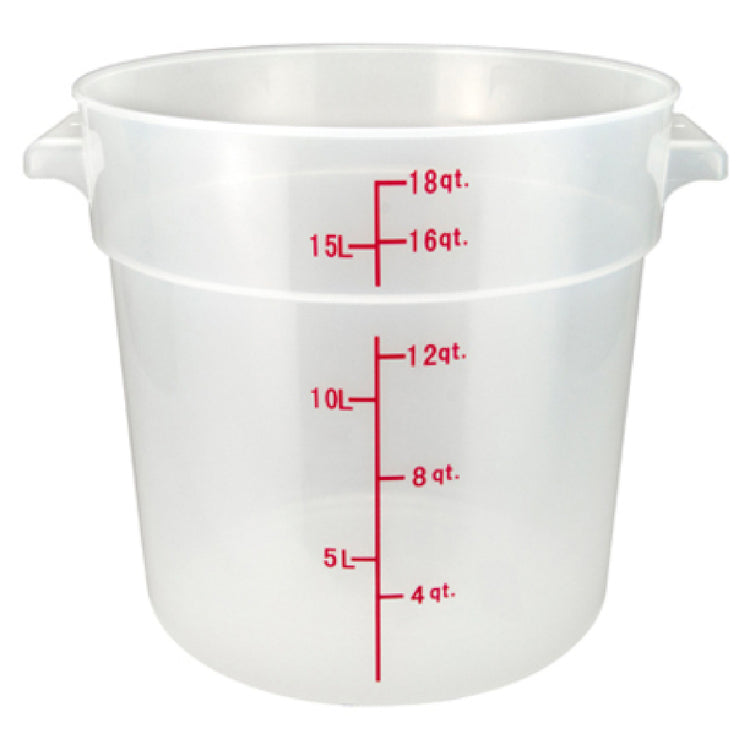 The Winco PTRC-18 Storage Container 18 Qt. 12.25" X 14.13" X 12"H is a versatile solution for various storage needs across different market segments. Crafted from stain-resistant polypropylene, this round container is BPA-free and ensures safety in food storage. Its translucent design allows for easy visibility of contents, while the built-in handles provide effortless maneuverability. The container's capacity is marked with graduation markings in both quarts and liters, facilitating precise measurement and inventory management. With a temperature range of -40°F to 160°F, it is suitable for both cold and moderately hot contents, making it ideal for use in diverse settings such as commercial kitchens, catering businesses, and food processing industries. The container is dishwasher safe, ensuring convenience and ease of cleaning, while its NSF certification underscores its compliance with high standards of public health and safety. Measuring 12.25 inches in diameter, 14.13 inches in height, and 12 inches in depth, the Winco PTRC-18 Storage Container is designed to optimize space and enhance organization in storage environments. This product provides a reliable and efficient solution for professionals seeking robust and versatile storage options.