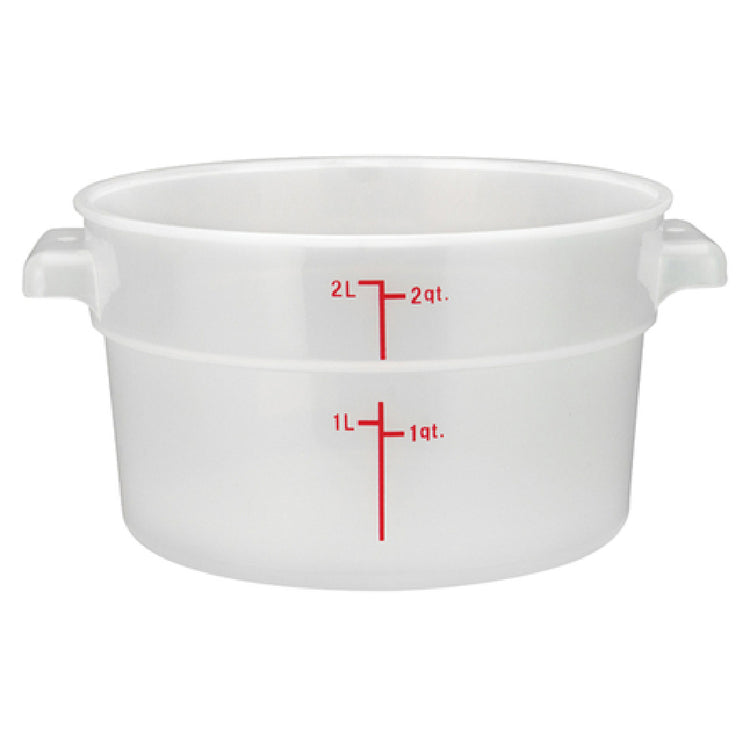 The Winco PTRC-2 Storage Container is a versatile 2-quart solution designed for efficient storage needs across various industries. With dimensions of 7.31 inches in diameter, 8.38 inches in height, and 4.25 inches in depth, this round container is compact yet spacious, suitable for managing small to medium amounts of contents. It is constructed from polypropylene, a material known for its durability and resilience. The container is designed to withstand a wide temperature range from -40°F to 160°F, making it ideal for both refrigerator and room temperature environments. Built-in handles offer convenient handling and transport, enhancing usability in fast-paced settings. Graduation markings in quarts and liters provide precision in measuring contents, a valuable feature for culinary and laboratory applications. The translucent design allows for easy monitoring of the container’s contents without opening, ensuring quick visual inventory checks. Moreover, it is stain-resistant and dishwasher safe, promoting ease of maintenance and long-term use. The container is BPA-free, aligning with health and safety standards, and certified by NSF, asserting its compliance with public health protection guidelines. The Winco PTRC-2 Storage Container is an ideal choice for professionals seeking reliable, safe, and durable storage solutions.