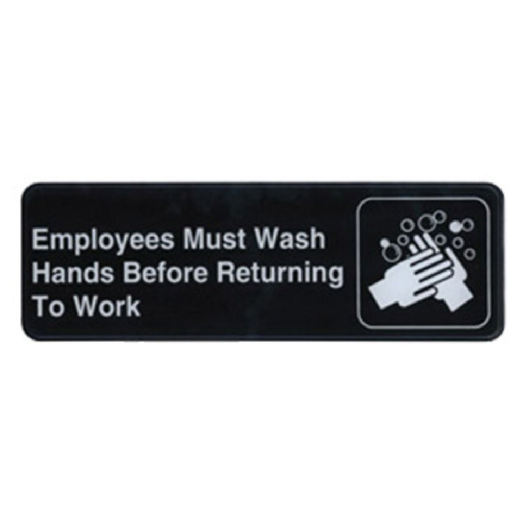 The Winco SGN-322 Information Sign With Symbol 9" X 3"H is a meticulously designed signage solution, ideal for various business environments, primarily in the food service industry. This sign features a clear, white imprint on a sleek black background, displaying the essential message: "Employees Must Wash Hands Before Returning To Work." The dimensions of the sign are 9 inches wide by 3 inches high, providing ample visibility without being obtrusive. The inclusion of an easy-to-understand symbol enhances its communicative effectiveness, ensuring that the message is universally recognizable and accessible to a diverse audience. This product is crafted to meet hygiene standards, making it an invaluable asset in restaurant kitchens, food processing areas, and other establishments where employee hygiene is critical. By integrating this sign into their workspace, businesses can effectively reinforce hygiene protocols, thereby contributing to a safer and more professional environment. The Winco SGN-322 is not just a sign; it is a proactive measure that supports health compliance and underscores a commitment to public safety. Its straightforward yet durable design ensures long-term use, and its utility spans across various markets within the industry, making it a versatile choice for establishments prioritizing cleanliness and safety.