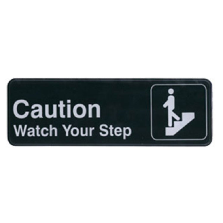 The Winco SGN-326 Information Sign With Symbol 9" X 3"H is designed to communicate critical safety messages with clarity and efficiency. This information sign features the message "Caution/Watch Your Step" prominently displayed in a white imprint on a black background, ensuring high visibility in various environments. The sign measures 9 inches in width and 3 inches in height, making it an ideal size for placement in numerous settings where caution is necessary. Its durable construction ensures longevity, making it suitable for high-traffic areas prone to wear and tear. The inclusion of a symbol further enhances its ability to communicate essential information quickly, catering to different market segments such as industrial facilities, commercial establishments, and public spaces where safety is a priority. The use of contrasting colors not only captures attention but also aids in the quick recognition of the warning message, reducing the risk of accidents. This sign's compact dimensions allow for versatile installation options, facilitating its integration into various safety protocols across multiple industries. With its emphasis on safety and visibility, the Winco SGN-326 stands as a vital component in maintaining secure environments.