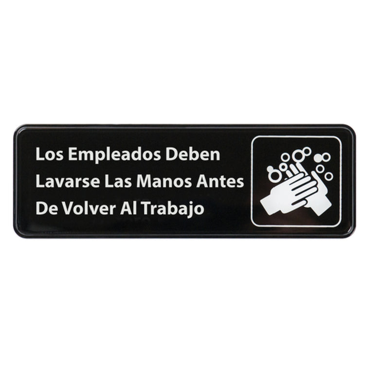 The Winco SGN-360 Information Sign With Symbol 9"-3"H is a versatile signage solution designed for diverse professional environments requiring clear communication of hygiene protocols. This rectangular sign measures 9 inches in width and 3 inches in height, making it a compact yet visible choice for restrooms and employee areas. It features an easy-to-read message printed in Spanish: "Employees Must Wash Hands Before Returning To Work," ensuring compliance with workplace hygiene standards across a variety of settings, including restaurants, healthcare facilities, and office spaces where multilingual communication is essential. The sign's design includes a symbol that universally communicates handwashing requirements, enhancing its effectiveness in environments with diverse staff and visitor demographics. Constructed from durable plastic, the sign is lightweight and resistant to wear, ensuring longevity in high-traffic areas. Its adhesive back facilitates easy installation on various surfaces, offering convenience and flexibility to business owners and facility managers. The white imprint on a black background ensures high contrast for maximum readability. This signage is an essential tool for maintaining public health standards, supporting industries where hygiene and safety are paramount. The Winco SGN-360 delivers both functionality and ease of use, making it a reliable choice for ensuring compliance and safety in the workplace.