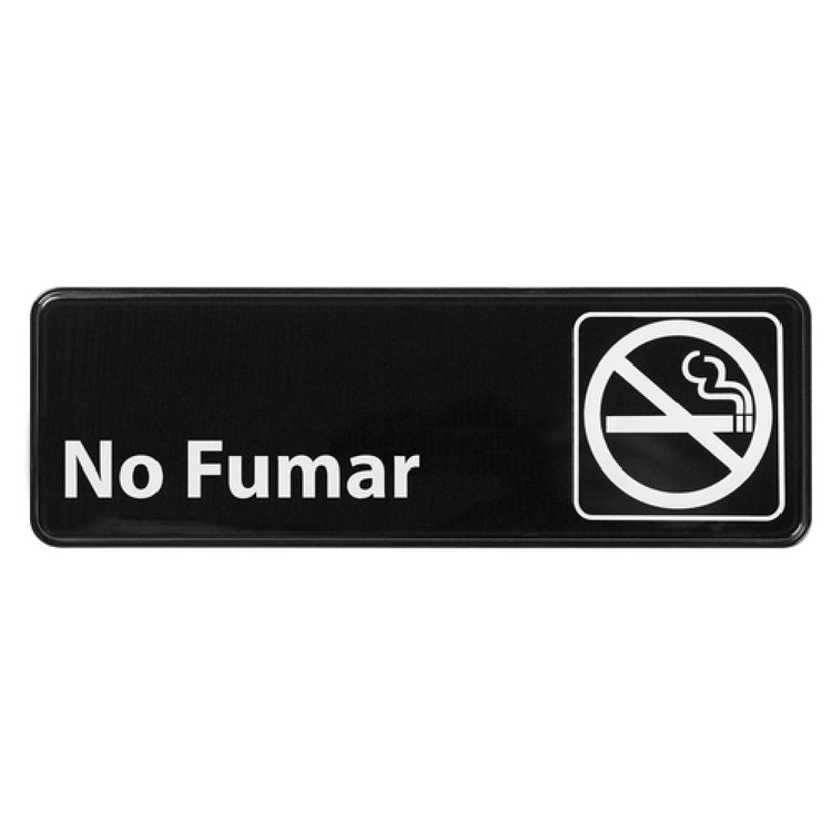 The Winco SGN-364 Information Sign With Symbol 9" X 3"H is an essential communication tool designed to convey specific messages effectively within diverse environments. Its dimensions of 9 inches in width by 3 inches in height make it a compact yet visible option for display. This sign features a bold "No Smoking" message presented in Spanish, with a white imprint set against a contrasting black background, ensuring high visibility and clear communication. Crafted from durable plastic, this sign guarantees longevity and resilience, even in high-traffic areas. Furthermore, the adhesive back facilitates easy installation on a variety of surfaces, enhancing its versatility across numerous settings. The inclusion of a universal symbol alongside the text broadens its accessibility, making it an ideal choice for international or multilingual spaces. The Winco SGN-364 is particularly well-suited for use in public areas such as restaurants, hotels, and offices, ensuring that critical information is conveyed efficiently to all patrons and staff. As a product, it underscores the importance of safety and compliance with non-smoking regulations, offering businesses a reliable and straightforward solution to manage their space effectively.