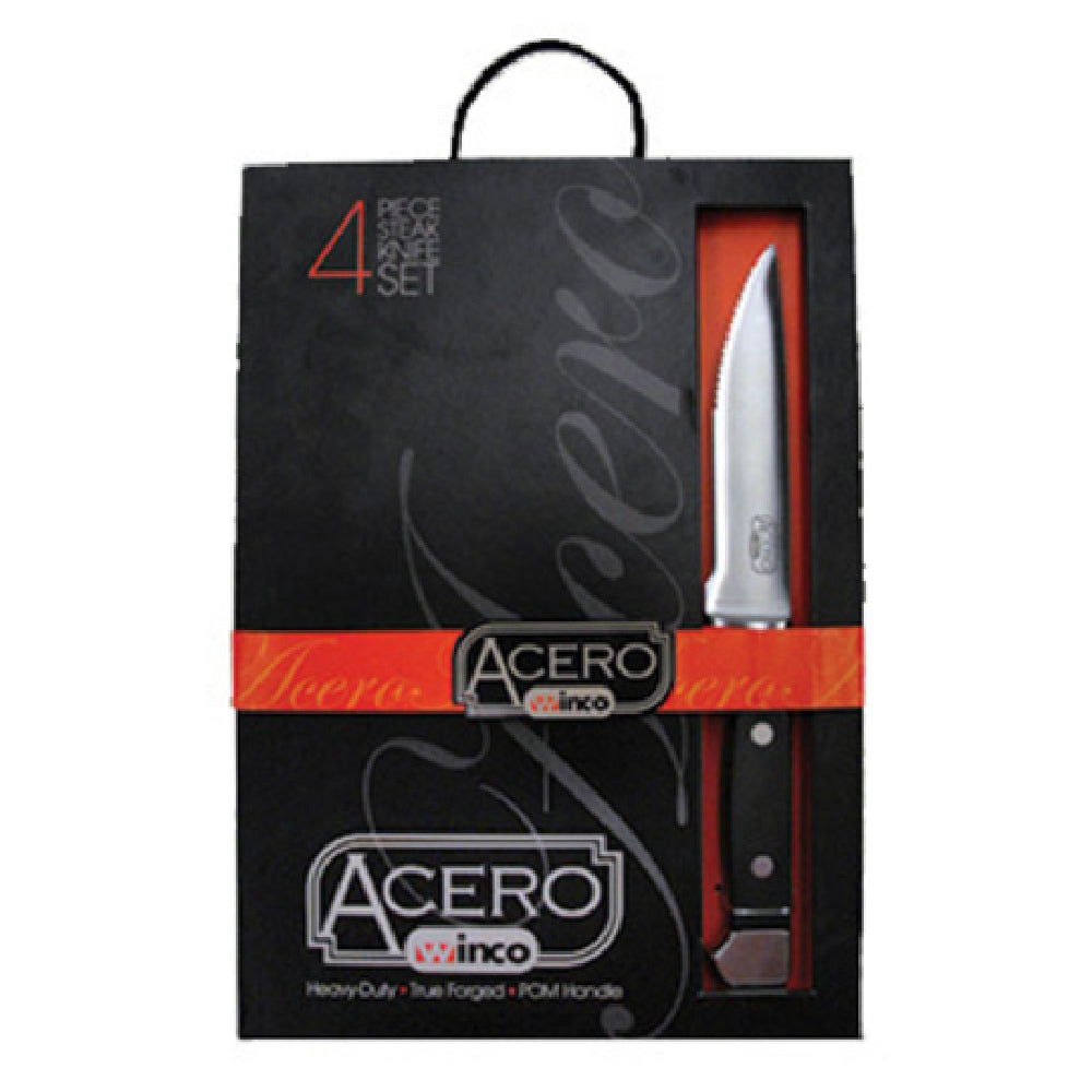 The Winco SK-1 Steak Knife is crafted with precision, featuring an Overall Length (O.A.L.) of 11-7/8 inches and a durable 5-inch blade. This steak knife is forged for exceptional strength and is classified as extra heavy-duty, making it suitable for demanding culinary environments. The blade is made from premium stainless steel, ensuring longevity and resistance to corrosion, a crucial feature for any high-usage kitchen tool. A black POM handle provides an ergonomic grip, enhancing user comfort and control during use. As a part of the Acero line, this knife represents a blend of style and function, ideal for both professional chefs and home cooking enthusiasts. Each pack contains four knives, making it a practical choice for both commercial and personal use. Adhering to NSF standards, the Winco SK-1 Steak Knife meets rigorous public health and safety requirements, emphasizing its suitability for professional culinary settings. This knife's combination of strength, durability, and ergonomic design makes it a valuable tool in any kitchen arsenal, offering reliable performance for various segment markets within the food industry.