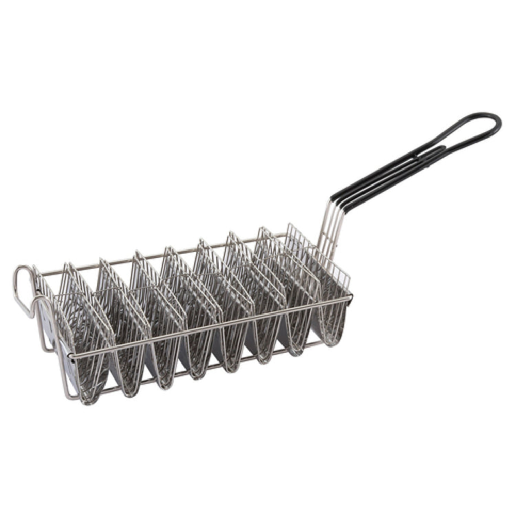 The Winco TB-8 Taco Basket holds (8) 6" shells and is designed in a practical rectangular shape, making it a valuable tool for restaurants and food service establishments that specialize in Mexican cuisine. Constructed with a durable nickel-plated finish, this taco basket offers superior resistance to corrosion and wear, ensuring longevity even with frequent use. Its ability to hold up to eight taco shells at a time optimizes kitchen efficiency by allowing for simultaneous preparation, which is particularly beneficial during high-volume service hours. The design of the basket ensures that each shell is held securely, preventing tipping and ensuring even frying or baking. This reliability and ease of use make the Winco TB-8 Taco Basket an essential piece for commercial kitchens that aim to deliver consistent quality and quick service. Its robust construction and thoughtful design cater to the needs of various market segments within the food industry, from small-scale taco stands to large restaurant chains, by enhancing the speed and quality of taco preparation. The rectangular framework not only provides stability but also facilitates easy storage when not in use, making it a practical addition to any kitchen setup.